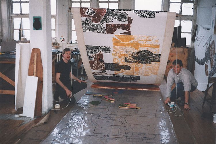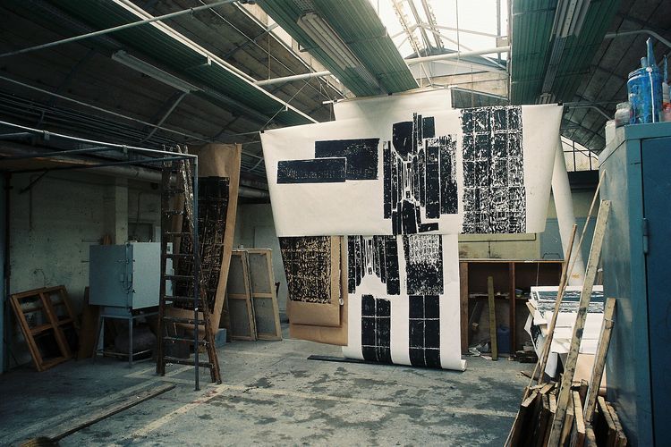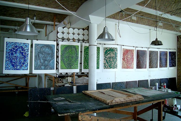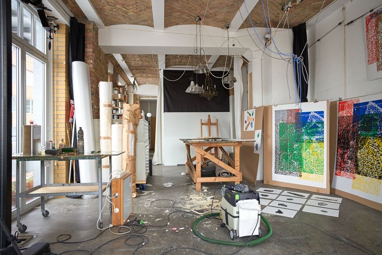 - Berlin –Am Karlsbad, Berlin                    Seit 2001 arbeite ich in einer renovierten ehemaligen Brotfabrik in der Nähe des Potsdamer Platzes, ein typischer Berliner Backsteinbau. Das Studio hat preußische Kappendecken, und ich kann in alle vier Himmelsrichtungen schauen. So konnte ich mir unterschiedliche Arbeitsplätze zum Drucken, Malen und für die Verwaltung einrichten.