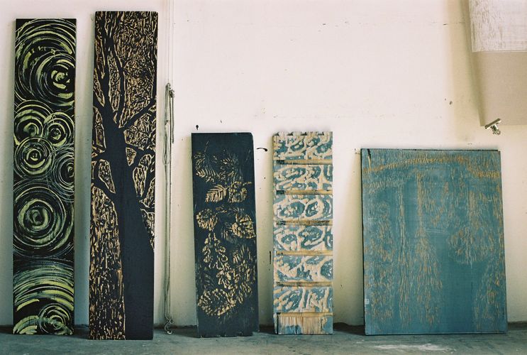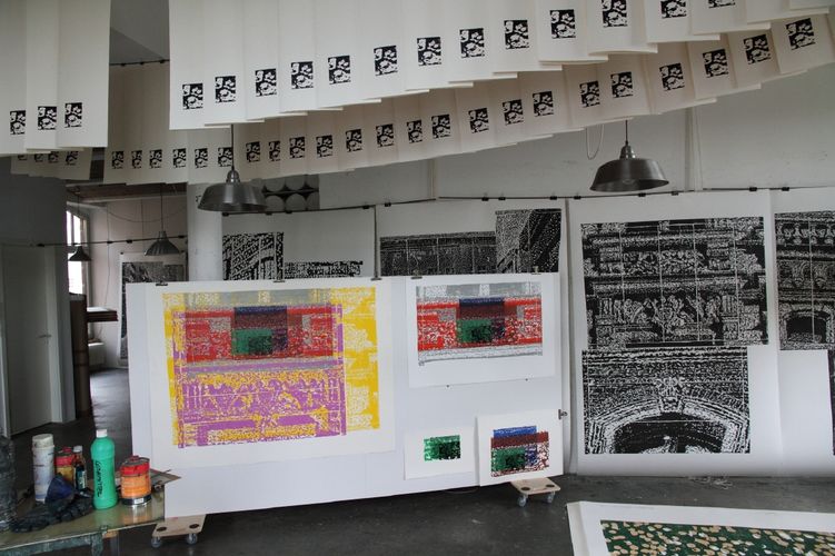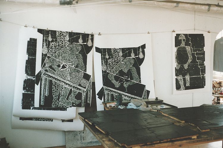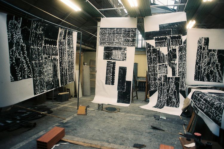 - ParisCité internationale des arts, Paris      Mein Studio in der Cité internationale des arts befand sich in einer großen Lagerhalle neben einem Tanzstudio für klassisches Ballett. Ich konnte in diesem offenen Raum einen Arbeitsplatz mieten, der Größe und Form eines Auto-Parkplatzes hatte. Diesen "Parkplatz" wählte ich als Ausgangspunkt für meine Serie "Paris, Ile St Louis - Ile de la Cité" und schnitt und arrangierte dort meine Druckstöcke.