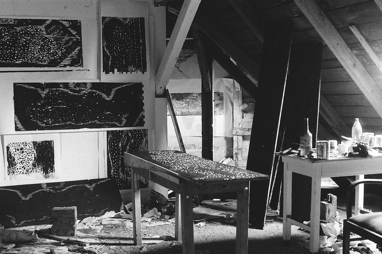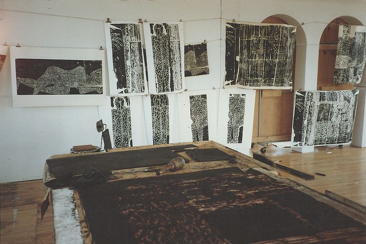 - LondonJacksons Lane/Highgate, London      Neben weiteren Atelierräumen in London habe ich 1987 eine Zeit lang in einem größeren "Garden flat" gewohnt. Die Möglichkeit, den angebundenen Garten zum Arbeiten zu nutzen, war für die verschiedenen Arbeitsprozesse sehr vorteilhaft: ich konnte draußen die Holzstöcke schneiden und drinnen den Druckvorgang durchführen. Die Spaziergänge im naheliegenden Park Hamstead Heath führten dazu, dass Naturbeobachtungen nun Teil meines Werkes wurden. Interessant war auch die Verbindung zwischen Arbeiten und Wohnen, welche zu einer ganzheitlichen Wahrnehmung des künstlerischen Arbeitsprozesses führte.